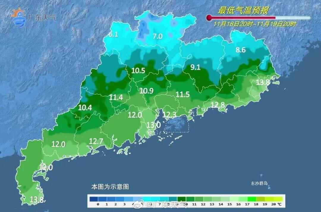 广东省气象台16日预计,17日(周一)上午起,强冷空气将影响粤北、傍晚到达广州、夜间到达南部沿海,早出晚归建议备件外套。18日至19日,广东气温进一步下降,期间粤北市县下降8℃~10℃,中南部市县下降6℃~8℃。过程最低气温将出现在19或20日早晨,粤北和珠江三角洲北部市县6℃~9℃(粤北高海拔山区1℃~3℃),南部沿海市县13℃~15℃,其余市县9℃~12℃,广州最低气温10℃左右。另外,冷空气影响期间,部分市县有小雨或零星小雨。