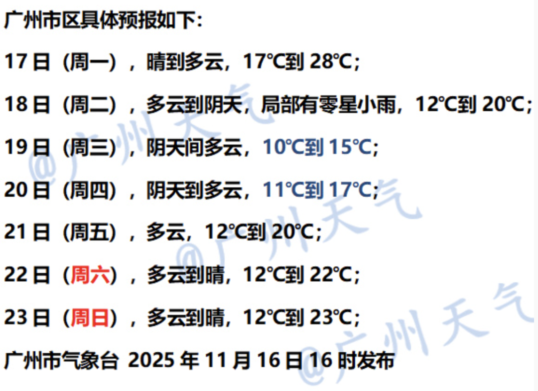 广州市气象台11月16日傍晚市区七天预报。图/新浪微博@广州天气
