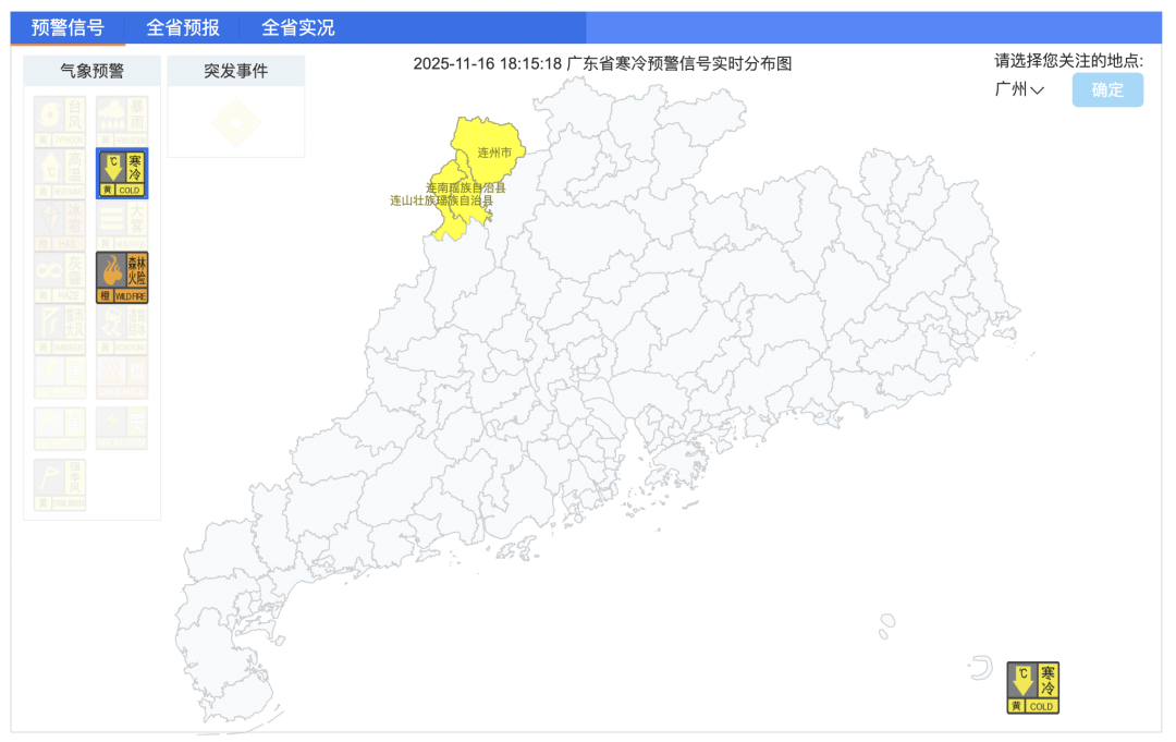 截至11月16日18时15分,广东寒冷预警信号发布情况。广东气象网截图