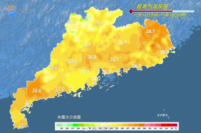 15-16日,广东大部晴到多云。最低气温:粤北大部、肇庆和云浮北部市县14℃~16℃,南部沿海市县19℃~21℃,其余市县17℃~18℃。