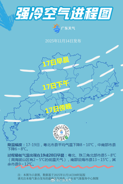 17-19日,粤北市县气温下降8℃~10℃,中南部市县下降6℃~8℃,过程最低气温出现在19或20日早晨:粤北、珠三角北部市县5℃~8℃,南部沿海市县13℃~15℃,其余市县9℃~12℃,广州市区最低10℃左右。