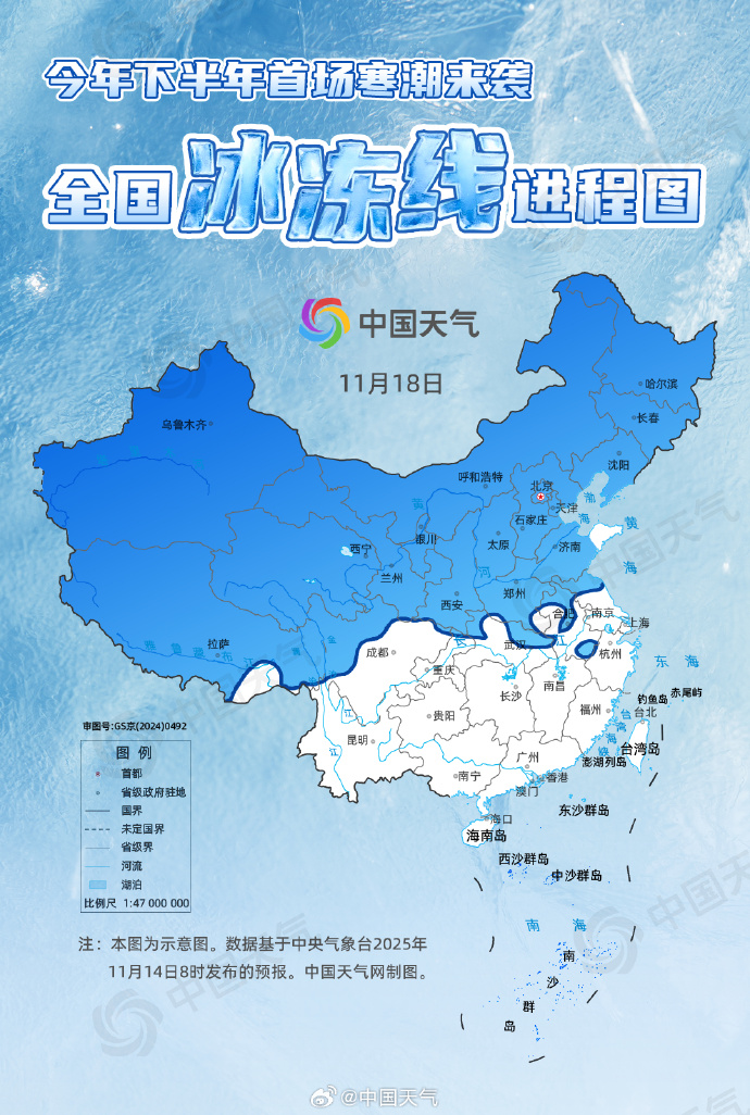 17日至18日,南方大部迎来降温,18日早晨冰冻线将南压至苏皖南部、湖北北部一带。