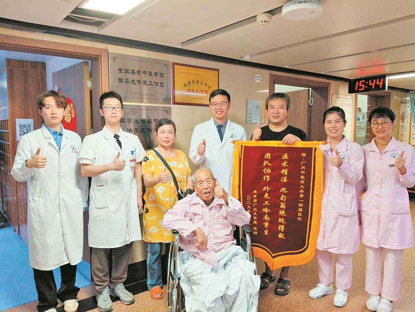 出院当天,姐弟俩特意定制了一面锦旗,上面真挚地写道:“医术精湛,九旬老翁绝处得救;团队协作,外来工岭南重生。”老人面对医生,也泪湿眼底。