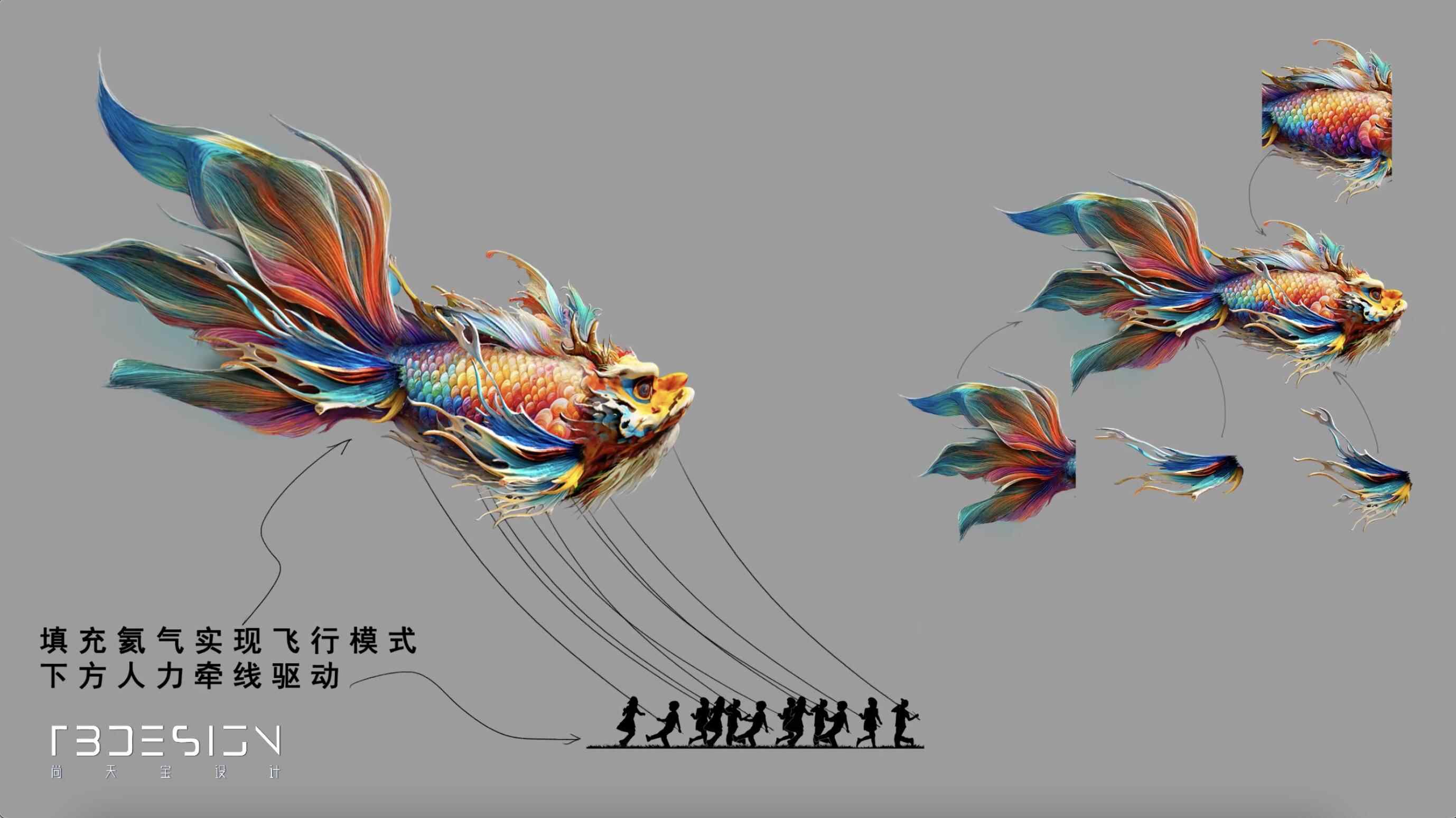 我想在其中实现“人本主义”理念,强调人与“鳌鱼”之间的动态互动与情感联结。同时,必须将人文精神与技术创新融合,让传统非遗在现代科技的赋能下焕发新的生命力。所以我们使用创新手段,对传统空飘工艺进行创新,以此推动非遗的活化传承与艺术表达的边界拓展。