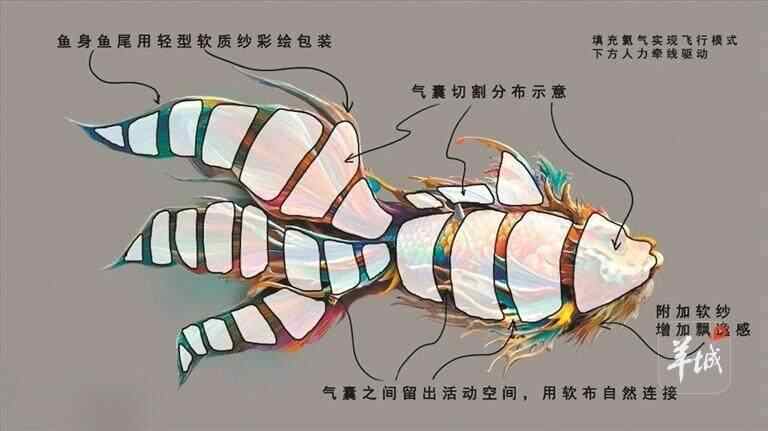 于是我们把鱼头、鱼鳃、鱼身、各分成五六段,尾巴分成更多段,并在气膜与气膜之间留出合理的活动空间,用软性的材料作为连接,让它可以左右摆动,上下弯折。这其实也是从一些非遗手作中得出来的经验,都是我们老祖宗的智慧。