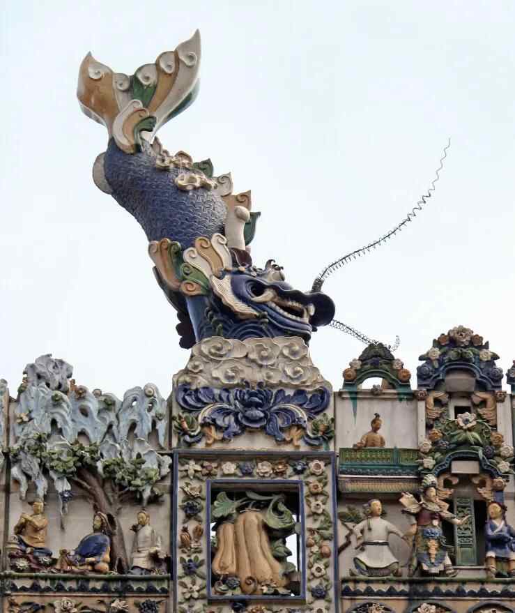 尚天宝:鳌鱼的形象来自我在大湾区数月的实地走访。我并不是广东人,却被这里独特的建筑风格吸引。与北方的庄重典雅有所不同,岭南建筑用色大胆鲜活,屋脊上的鳌鱼造型也比北方的鸱吻更为生动,很吸引眼球。