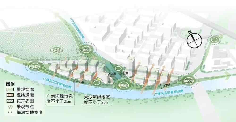 规划新增约4.7公顷公园绿地,鼓励贯通广佛河与大沙河沿线“T”型滨江绿通廊,确保广佛河(临河≥25m)、大沙河(临河≥20m)沿岸廊道空间的贯通与开放,集中供给开敞空间,提供可游可赏的滨河景观。未来,项目将结合场地空间打通多条垂江通廊,串联周边花卉田景,形成“碧廊入园,花田环绕”现代化产业园区风貌。