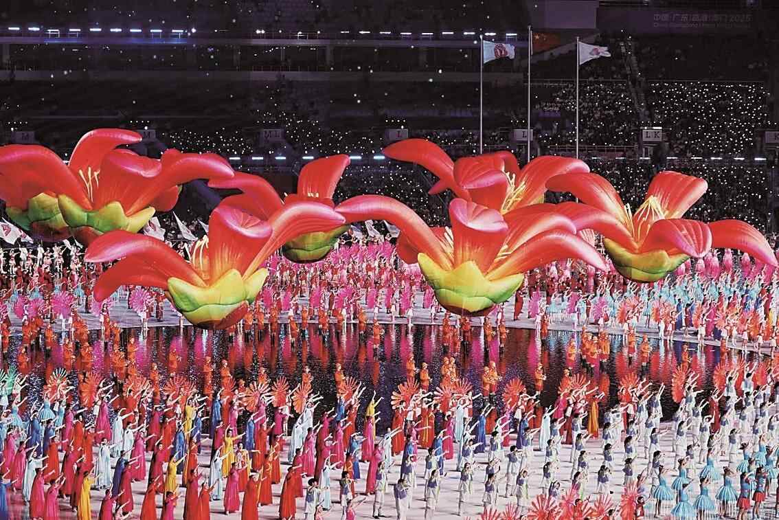 开幕式前,将进行总时长65分钟的暖场表演,以《湾区潮涌》为主题,分为“潮起”“声漾”“雄风”“筑梦”四个篇章,展现粤港澳传统与现代交融、体育与艺术共生的繁荣图景。开幕式的开场,一场跨越古今的科技与人文的“千年对话”,将徐徐开启华彩篇章。