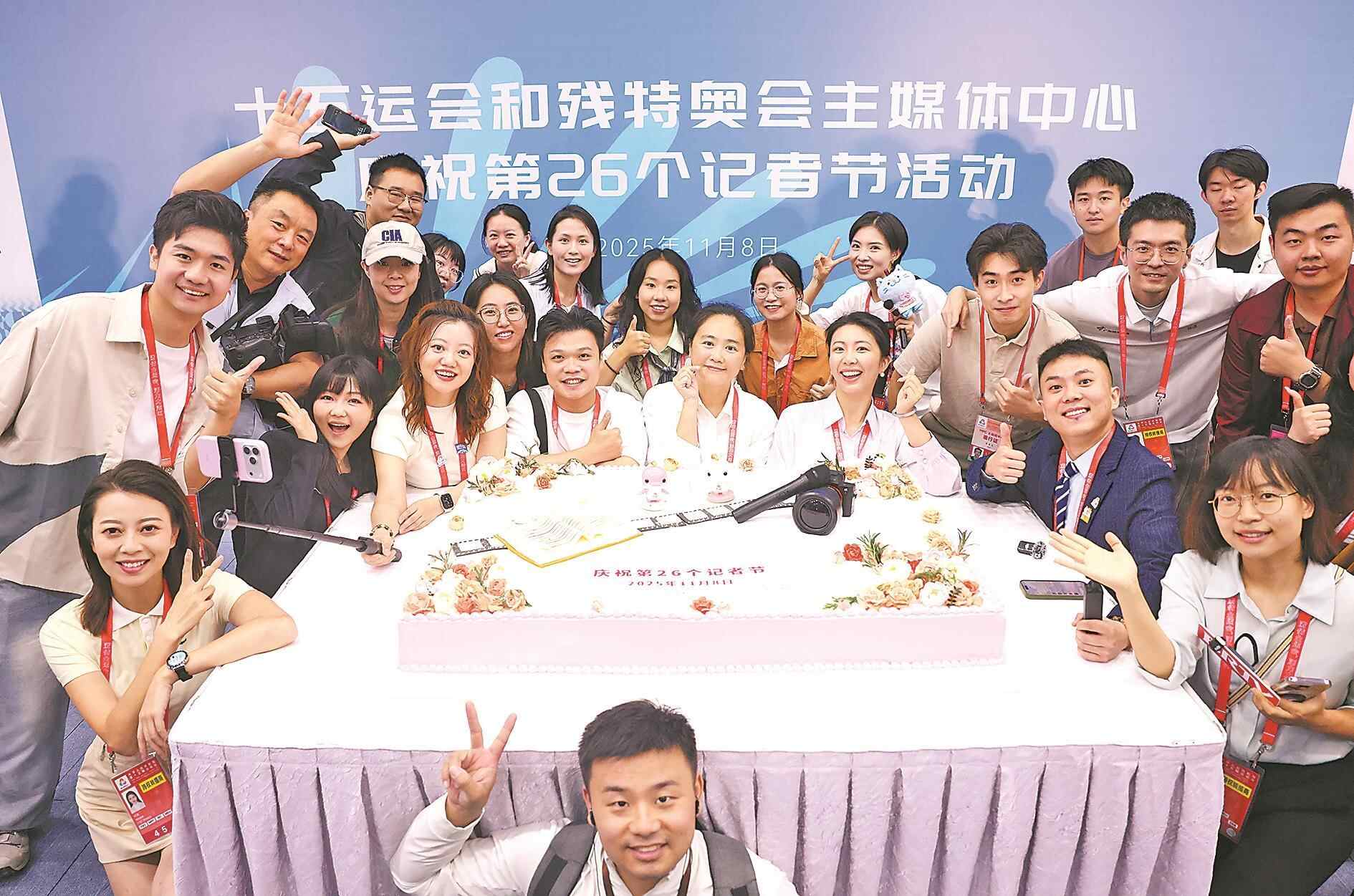 “记者节快乐!”11月8日,庆祝第26个记者节活动在十五运会和残特奥会主媒体中心热烈举行。现场的记者们共同为属于自己的节日欢呼。