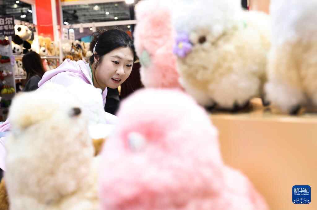 11月8日,在第八届进博会消费品展区,参观者在秘鲁温暖驼品牌的羊驼毛制品前驻足观看。