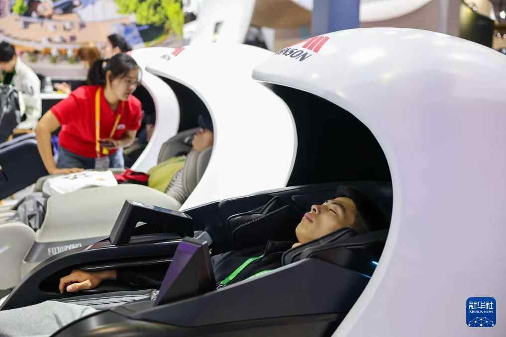 11月8日,在第八届进博会消费品展区,观众在乔山健康科技展台体验一款按摩椅。