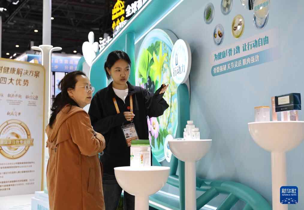 11月8日,在第八届进博会消费品展区,参观者(左)听工作人员介绍健康保健产品。