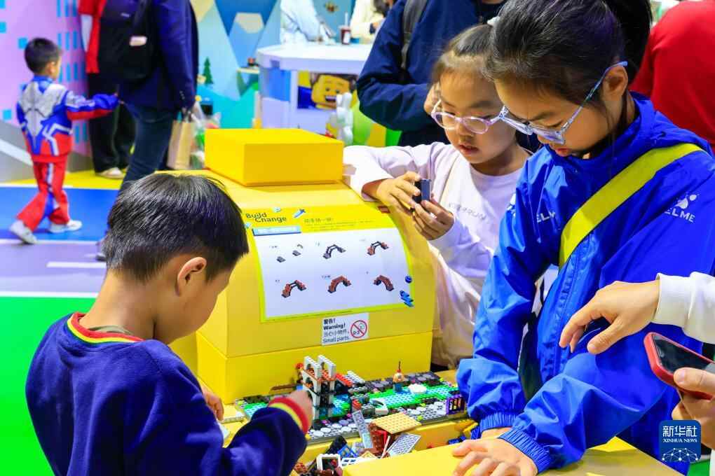 11月8日,在第八届进博会消费品展区,儿童在乐高展台动手体验积木。