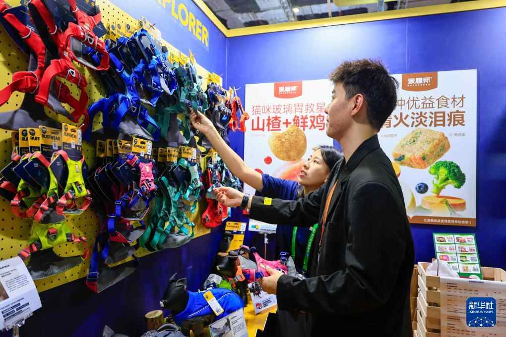 11月8日,在第八届进博会消费品展区,观众(右)在一家宠物用品店选购。