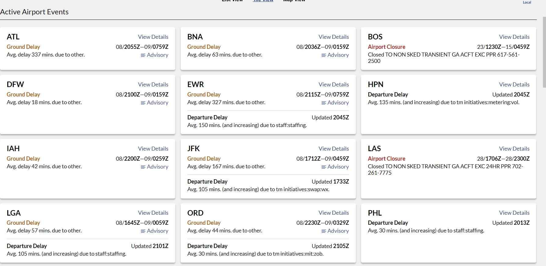 △航班追踪网站截图,美国部分出现延误情况的机场