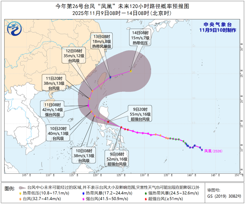 与此同时,位于菲律宾以东的今年第26号台风“凤凰”,已经在9日凌晨加强为超强台风级。预计“凤凰”将以每小时30公里左右的速度向西偏北方向移动,9日夜间在菲律宾吕宋岛东部沿海登陆,穿过吕宋岛后强度明显减弱,并将于10日中午前后移入南海东部海面,之后强度还将有所增强,11日开始逐渐转向北偏东方向移动,趋向台湾岛南部沿海,强度快速减弱。由于现有预报结论时效较长,台风“凤凰”的后期路径及强度仍有不确定性,请公众留意气象部门后续发布的预报预警信息。
