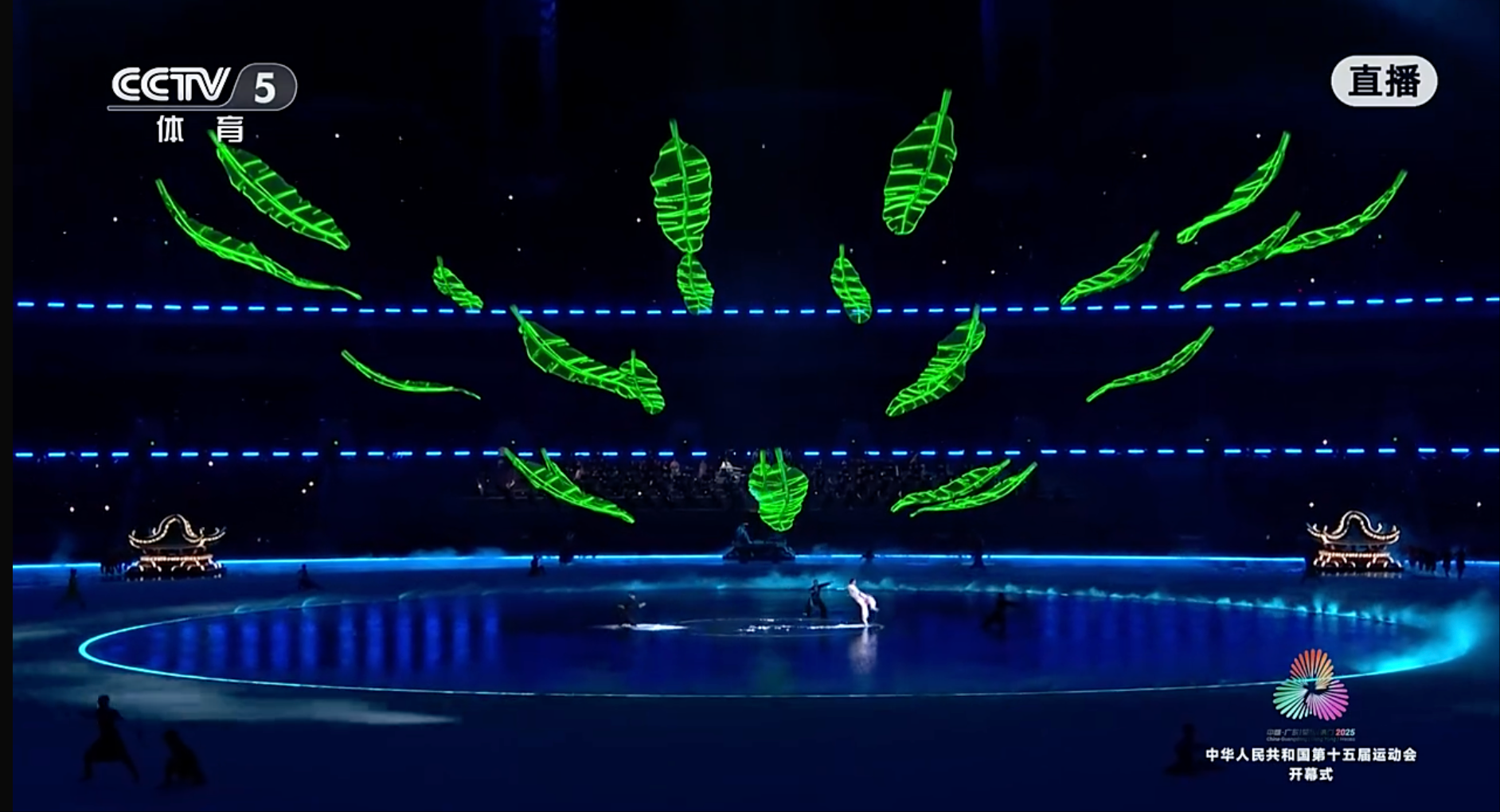 十五运会开幕式第二章的两个经典片段让人印象深刻,武侠高手在空中雨打芭蕉的名场面震撼人心,尽显武侠风;而灯笼戏台在水中缓缓升起,伴随着粤剧唱腔婉转而来,在粤韵飘飘的氛围中,场内外观众共享粤剧风华。两个片段堪称岭南文化独特魅力的展示,而24片芭蕉叶和灯笼戏台的背后,是广州美术学院集体智慧和力量的结晶。