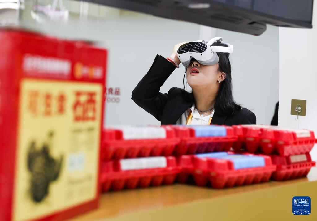 11月7日,在位于农食产品展区的正大集团展台,一名参观者使用VR设备观看。正大集团是进博会八届“全勤生”。