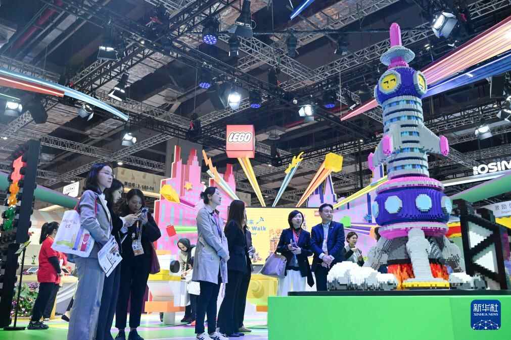 11月7日,观众在消费品展区乐高展台参观。乐高是进博会八届“全勤生”。