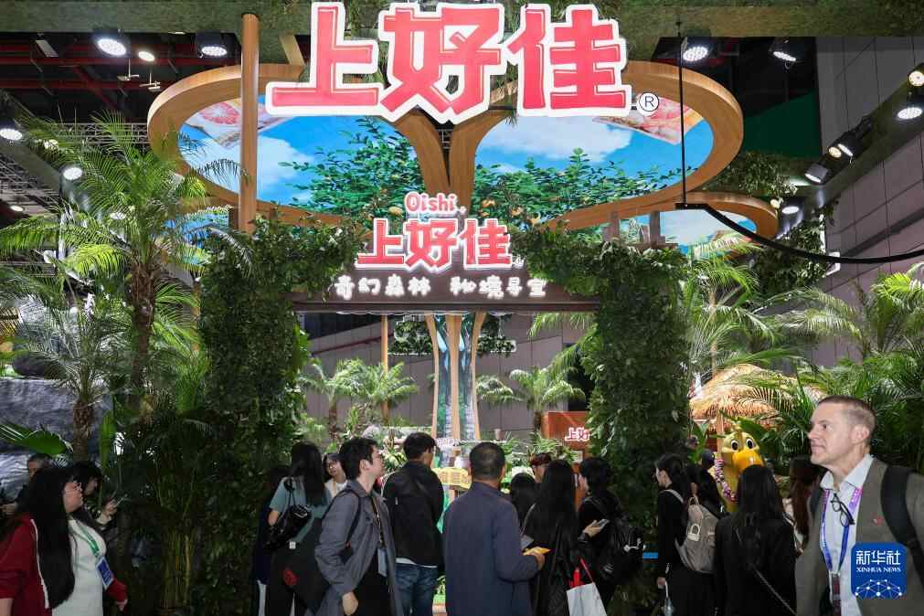 11月7日在农食产品展区拍摄的上好佳展台。上好佳是进博会八届“全勤生”。