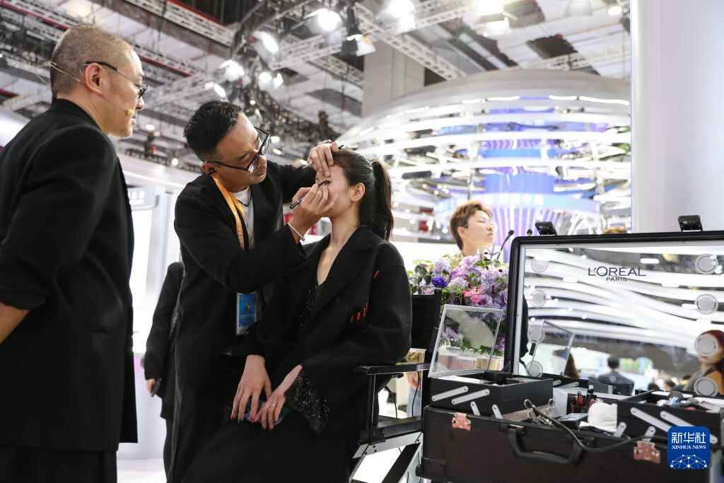 11月7日,一名参观者在消费品展区的欧莱雅展台体验美妆服务。欧莱雅是进博会八届“全勤生”。