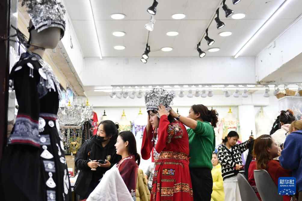 11月6日,游客在凤凰古城一家旅拍店内准备着装。