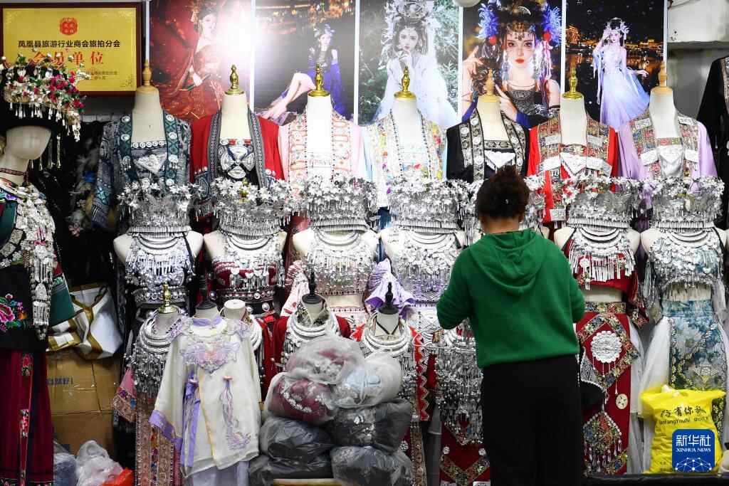 11月6日,凤凰古城一家旅拍店店主在店内整理服装。