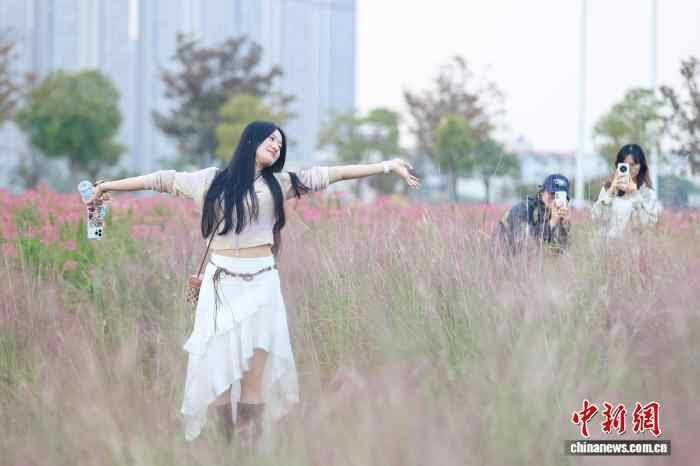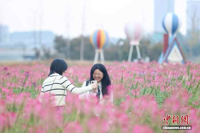 11月7日,江西南昌马兰圩湿地公园的粉色花海“醉”迷人。当前,马兰圩湿地公园种植的百日草、醉蝶花、马鞭草等花卉连片绽放,绚丽多姿的花海吸引了不少市民游客前来赏花和拍照。中新社记者 刘力鑫 摄