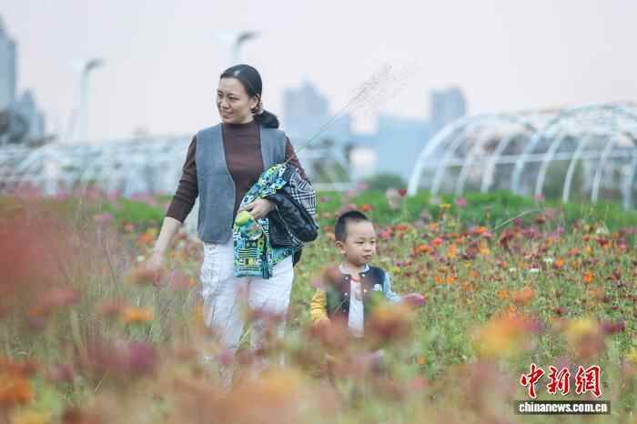 11月7日,江西南昌新建区,家长带着小朋友从马兰圩湿地公园的花海中走过。当前,马兰圩湿地公园种植的百日草、醉蝶花、马鞭草等花卉连片绽放,绚丽多姿的花海吸引了不少市民游客前来赏花和拍照。中新社记者 刘力鑫 摄