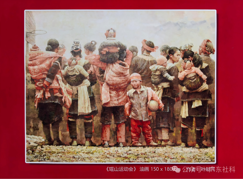油画《瑶山运动会》,以独特的“观赛”视角切入,巧妙地以众人的背影,描绘瑶族群众参与运动会的热烈场景。作品早在2005年,十运会期间,获得第六届“全国体育美术作品展览”银奖。