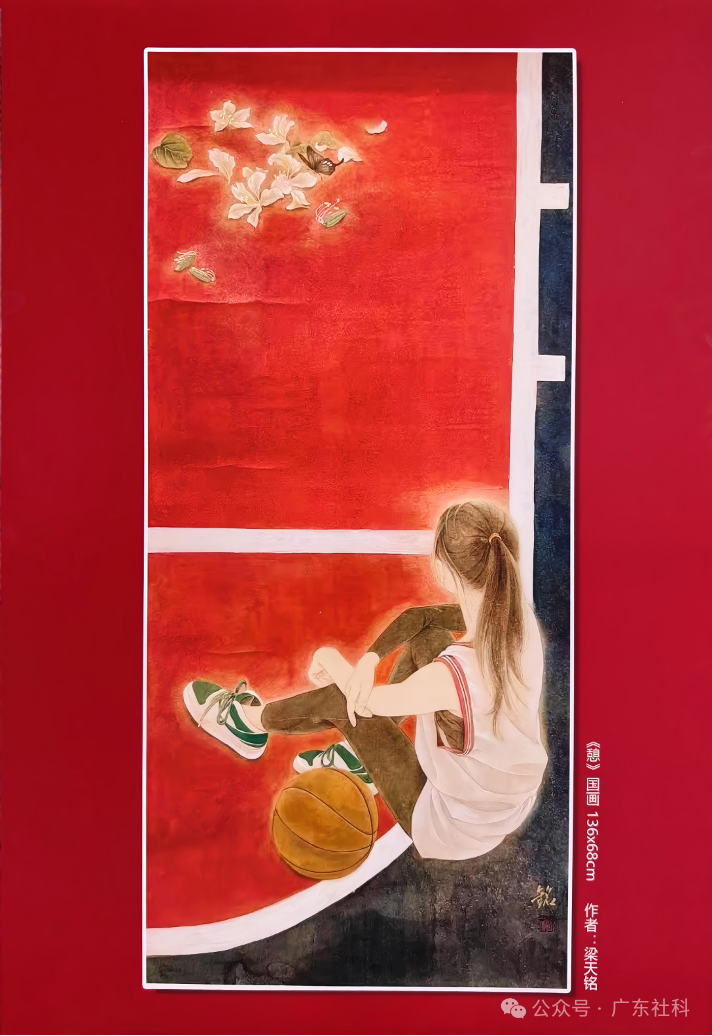 国画《憩》捕捉女篮运动员赛后静思的片刻,以动静相生的笔法呈现体育之美与人文之思。
