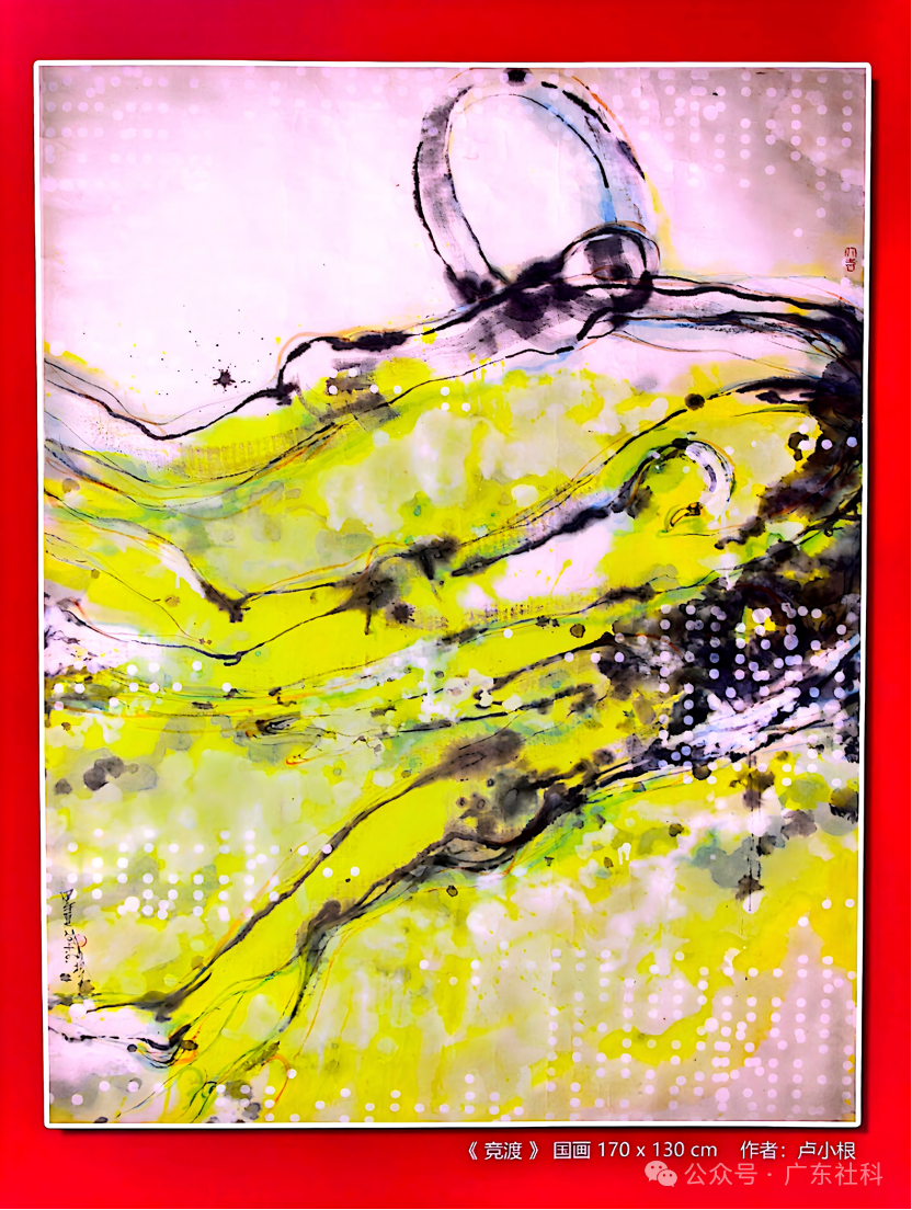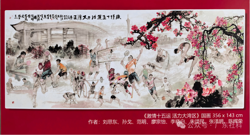 巨幅国画《激情十五运 活力大湾区》由刘思东等8位名家共创,以3.5米长的篇幅融合十多项运动场景与木棉花、广州塔等湾区元素,尽显体育与人文交相辉映的恢宏气势。