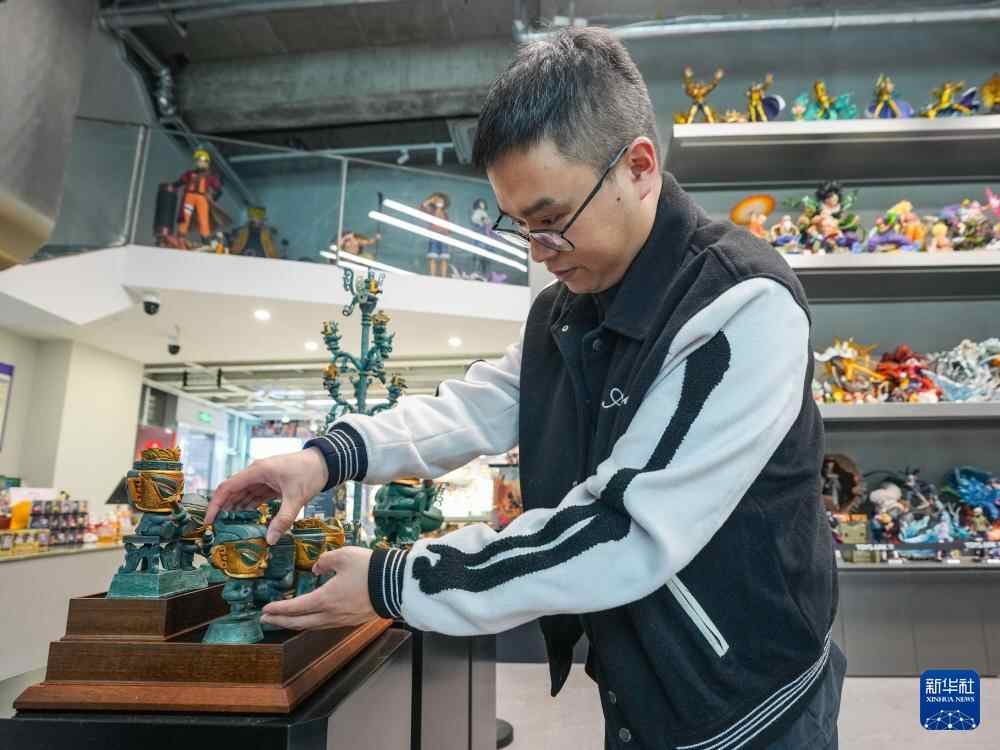 11月5日,在成都天府国际动漫城,与三星堆博物馆合作的文创产品策划运营师曾舟在摆放自己设计的三星堆文创盲盒新品。