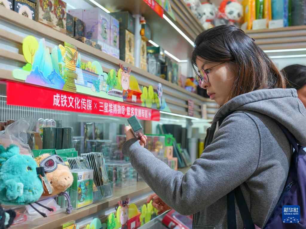 旅客在位于成都东站的三星堆博物馆与铁路部门联名文创专区商店内选购文创产品(11月3日摄)。