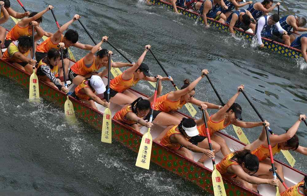 在香港仔海滨公园举行的龙舟竞渡大赛中,参赛选手奋楫争先(2023年6月22日摄)。