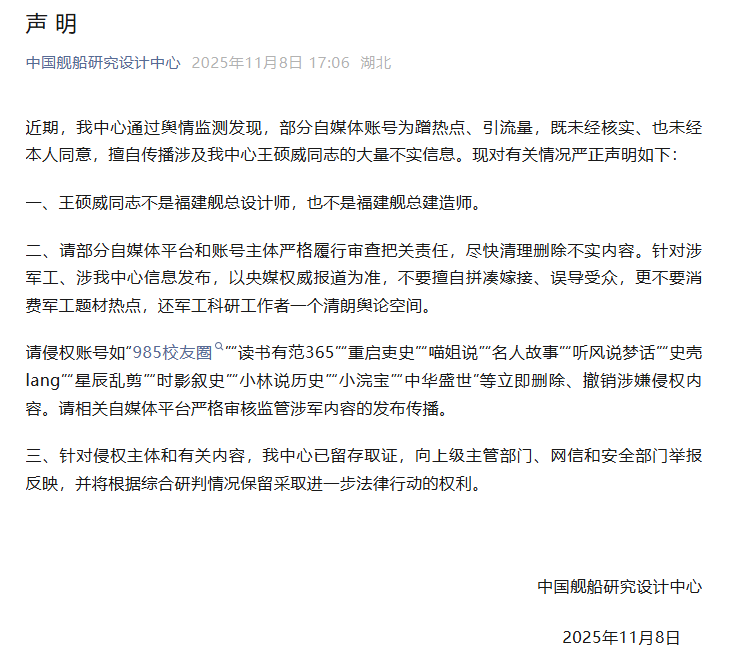 中国舰船研究设计中心11月8日发布一则声明,全文如下: