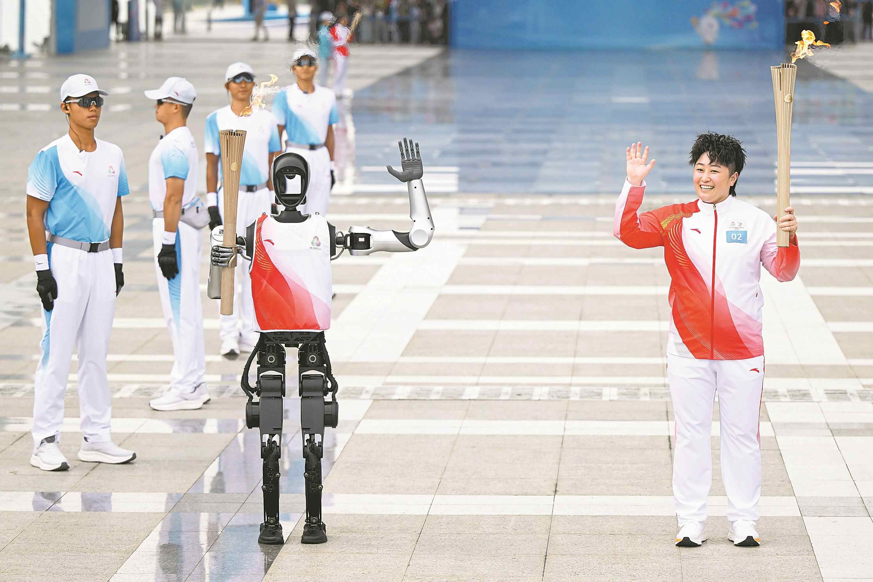 实际上,除了取火的科技感拉满,此次火炬传递也凸显粤港澳大湾区作为国际科技创新中心的产业优势,展示科技与体育的深度融合。全球首个5G-A人形机器人火炬手“夸父”丝滑完成两棒火炬交接、低空飞行器让火炬在深圳上空划出优美的弧线;从无人驾驶汽车穿行广州老城区,到各类硬核科技的深度应用,既彰显了“湾区智造”将未来照进现实的实力,也让科技与体育的融合变得可感可触。