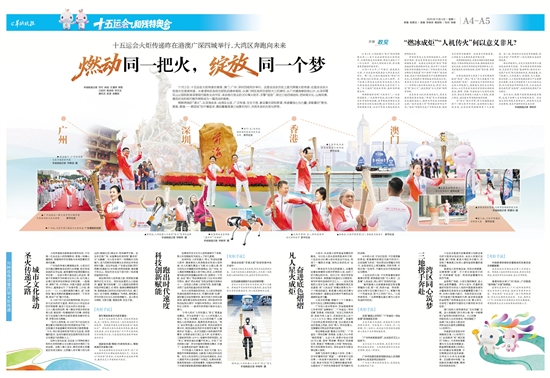 十五运会是首次由粤港澳三地联合承办的大型综合性运动会,全运火炬首次在香港、澳门传递,彰显大湾区多元魅力,亦定格了粤港澳三地同心谱写奋进新篇的美好画面。