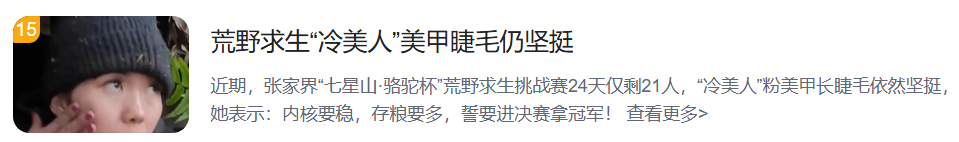 据报道,“冷美人”参赛十几天后瘦成闪电,在山中采野果、野菜充饥,手指嘴唇开裂,其瘦到两颊凹陷,但睫毛美甲依然坚挺,引网友询问其假睫毛款式。