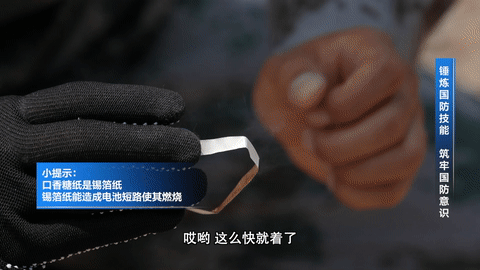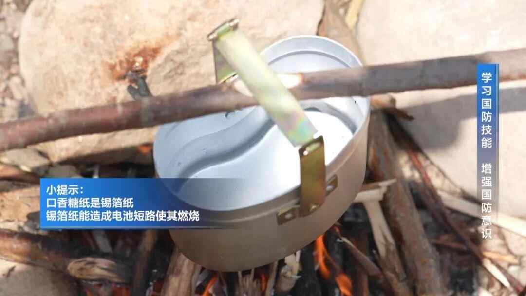 口香糖纸其实是锡箔纸,用口香糖纸连接电池正负两极后,就会造成短路,电源短路时会形成非常大的电流,电流使口香糖包装纸温度升高,当达到燃点时就会燃烧,就可以用来加热饮用水或食物。