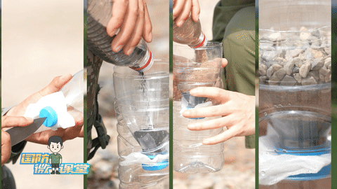 野外水源通常杂质较多,可以使用常见的材料,比如纱布、沙子、石子、木炭、塑料瓶用于进行过滤。