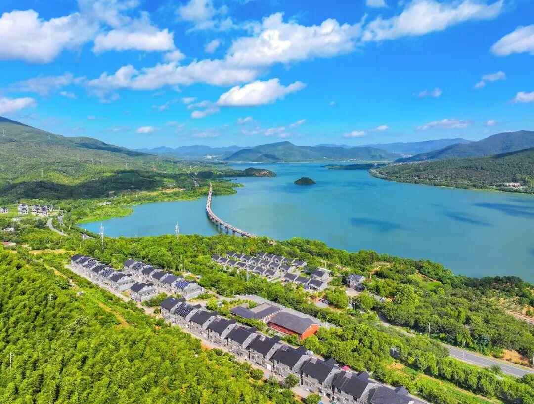 浙江省湖州市长兴县小浦镇合溪村,水库与青山、村庄、道路相映成景,构成一幅风光旖旎、生态秀美的绿水青山壮丽画卷。陈海伟 摄