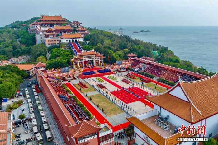 11月2日,空中航拍壮观的秋祭妈祖大典。妈祖祭典与黄帝陵祭典、祭孔大典并称为“中华三大祭典”,每年都吸引大批海内外信众前来参加。当日,第二十七届湄洲妈祖文化旅游节在福建省莆田市湄洲岛开幕,盛大的秋祭妈祖大典揭开本届旅游节大幕。(无人机照片)中新社记者 王东明 摄