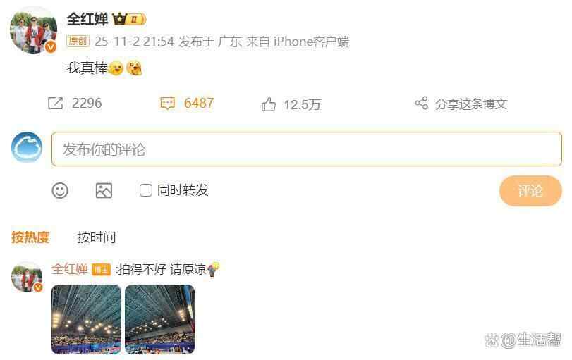 赛后,全红婵在社媒上发文:我真棒。在评论区,她还晒出现场图,表示:“拍得不好,请原谅。”