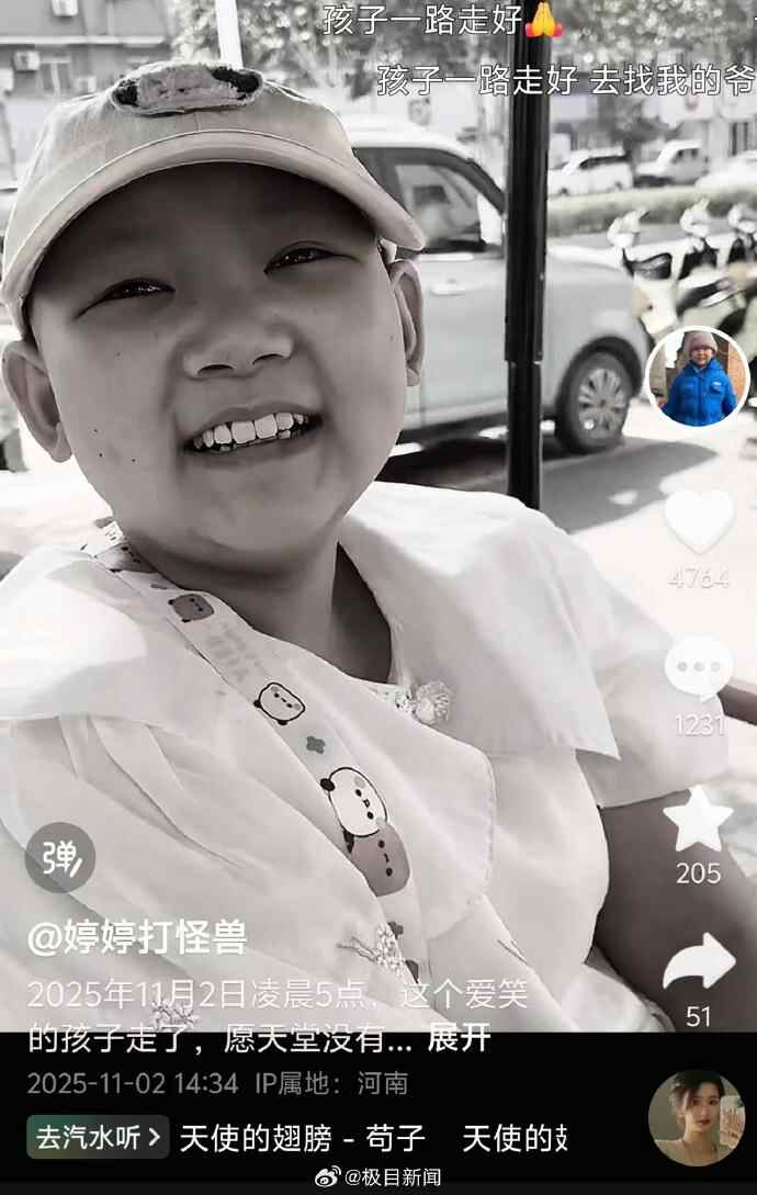11月2日凌晨5时许,来自河南濮阳的抗癌博主“婷婷打怪兽”不幸离世,年仅11岁。3日,该账号的运营者赵女士告诉记者,账号记录的是侄女婷婷的抗癌生活,希望她能被更多人记住,也希望肾母细胞瘤这个疾病被更多人知晓。