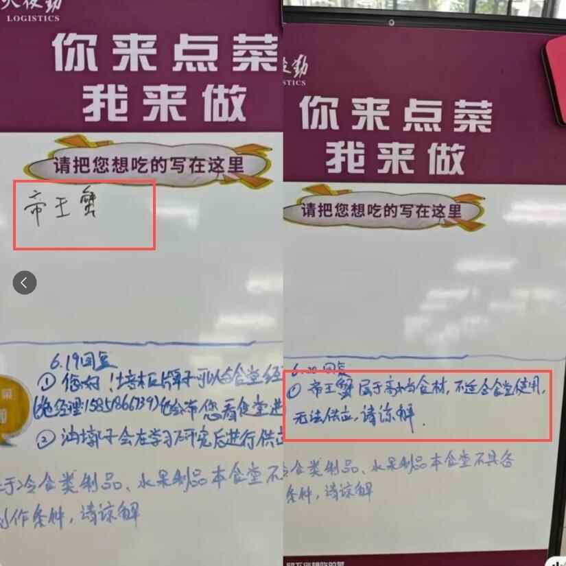 据网传图片显示,在今年6月份,在南京大学食堂的点菜留言板上曾出现过“帝王蟹”,但当时食堂回复为,“帝王蟹属于高档食材,不适合食堂使用,无法供应,请谅解。”