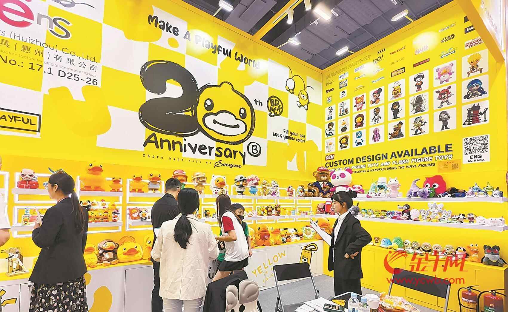 不远处,盈森玩具的明黄色展台上,小黄鸭化身招财猫、歌手、旅行者等角色,趣味十足。展位工作人员李兰(化名)介绍,企业长期深耕盲盒潮玩,虽未出现“爆款”,但积累的IP开发经验让他们在原创市场中更具底气。“从代工到品牌,不仅是模式升级,更得益于长期服务国际客户所积累的生产与品控经验。”