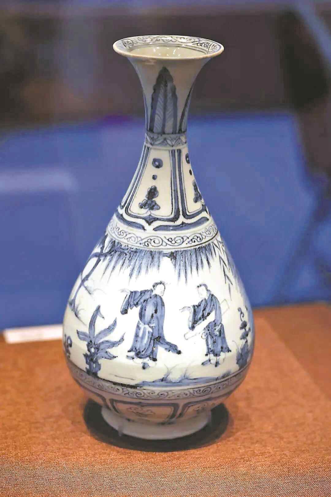 在展厅中间,广东省博物馆的镇馆之宝元代青花人物图玉壶春瓶被放在独立的专门展柜中,看似传统的器型与纹饰,却藏着跨文明融合的密码。