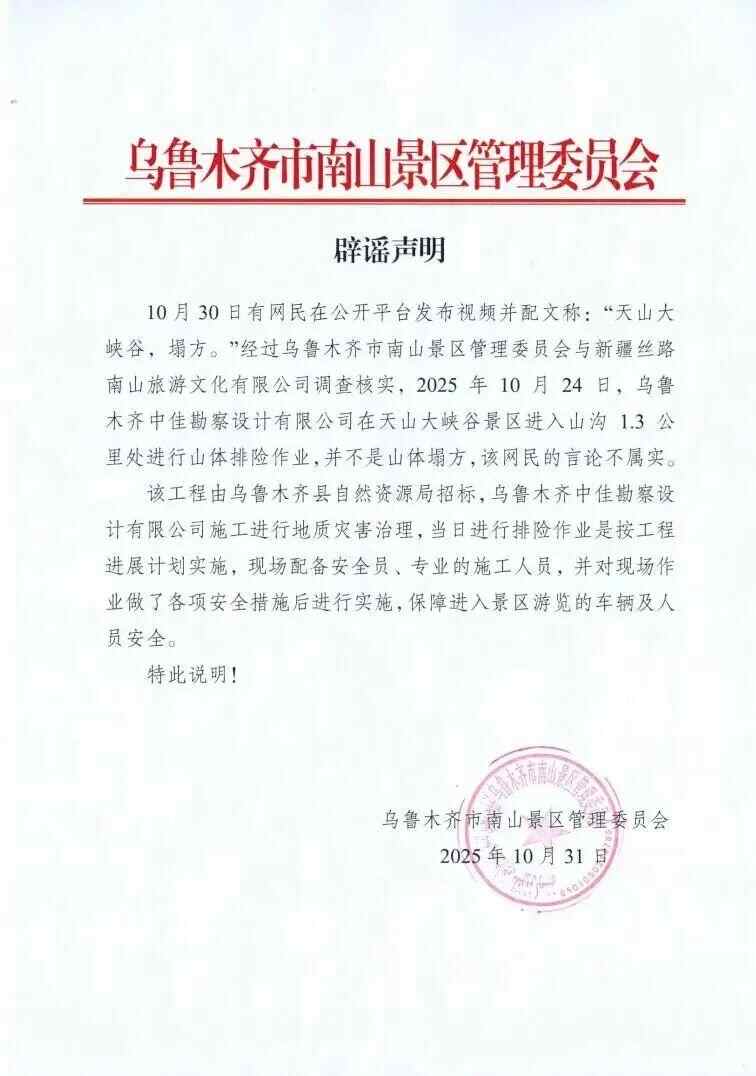 近日,有网民在互联网平台发布视频并配文称“天山大峡谷塌方”引发网民关注。经与乌鲁木齐市南山景区管理委员会核实,情况不属实。2025年10月24日,乌鲁木齐某勘察设计有限公司在天山大峡谷景区山沟1.3公里处进行山体排险作业,并不是山体塌方。