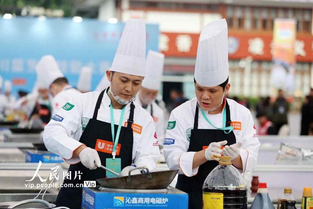 11月1日,2025世界川菜烹饪技能大赛现场,参赛厨师正在烹饪特色菜。李华时摄(人民图片网)